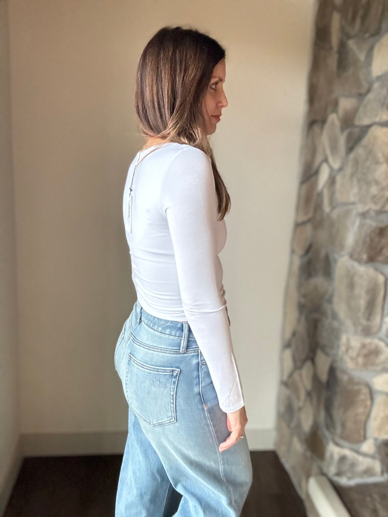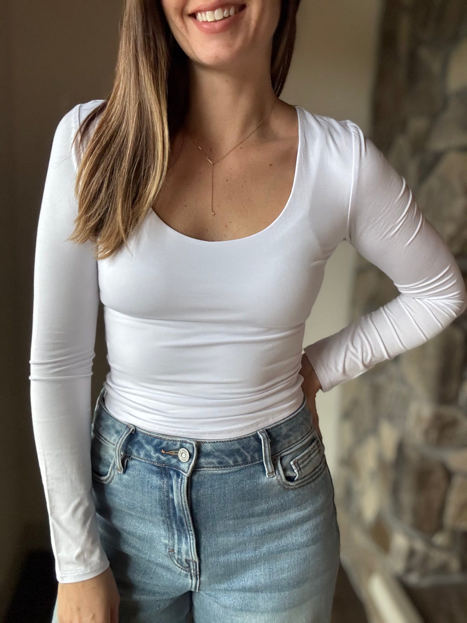 You're going to love this top for its simplicity. It is a standout on its own but it's also so great for layering. The body of this tee is double layered for extra smoothing.
