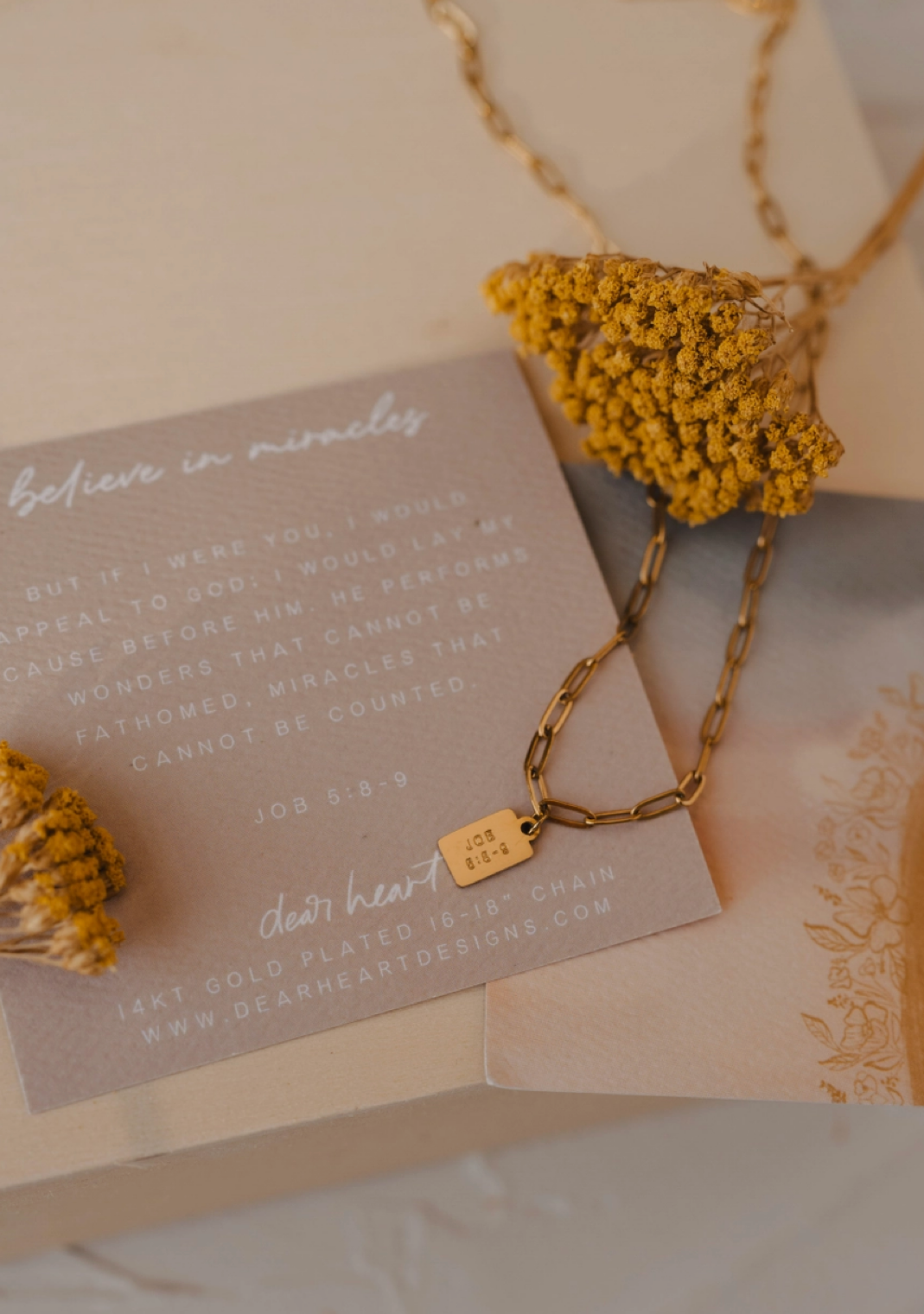 Details: "Believe in Miracles" on one side and "Job 5:8-9" on other