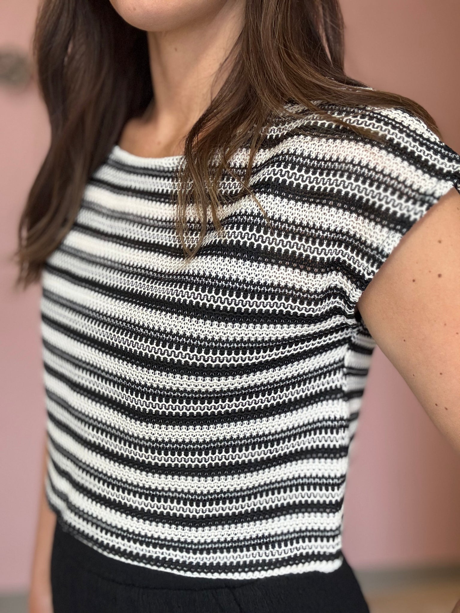 You're going to have fun finding different ways to wear this top! We are loving it with a black tank and our new black wide leg flowy pants but it's also going to look great with white bottoms, denim, skirts and over dresses! Could also be a cute swimsuit cover-up with a pair of shorts! This is definitely a cropped style but if you wear it with a black or white tank tucked underneath, it'll blend right in without showing any belly!