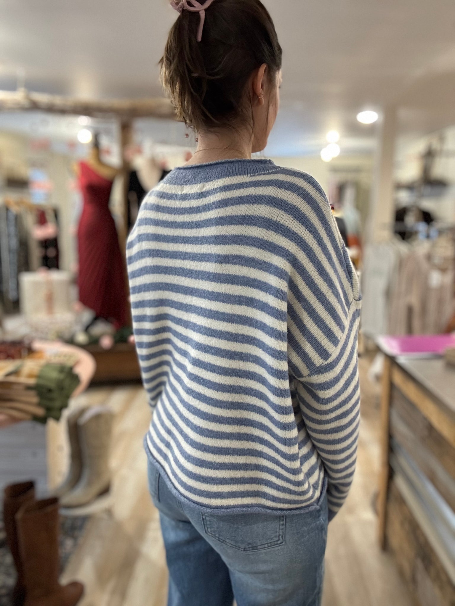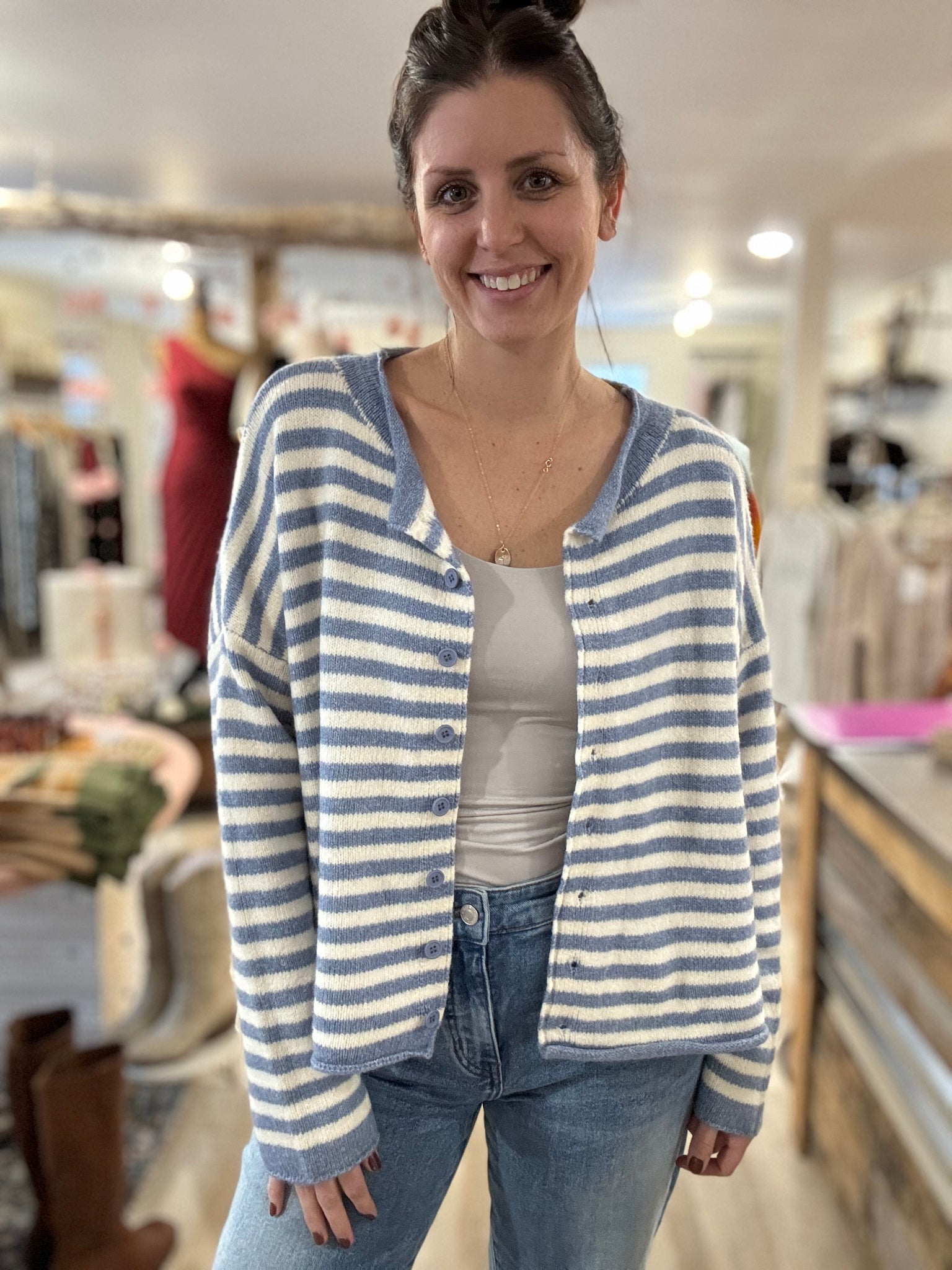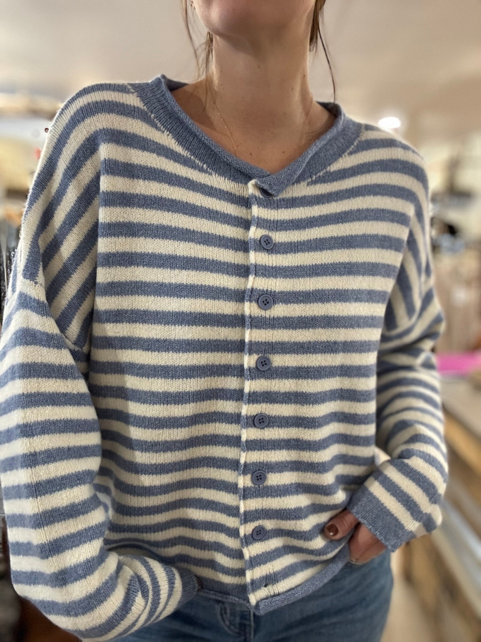 blue + ivory stripe button down cardigan