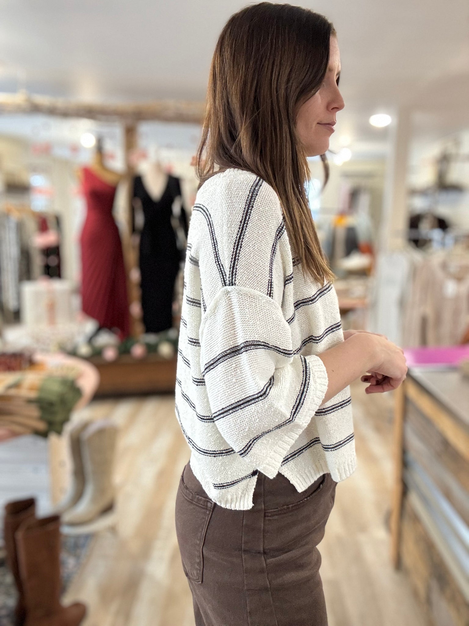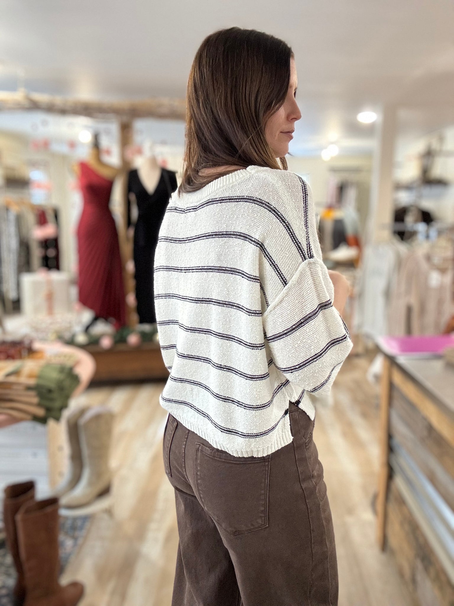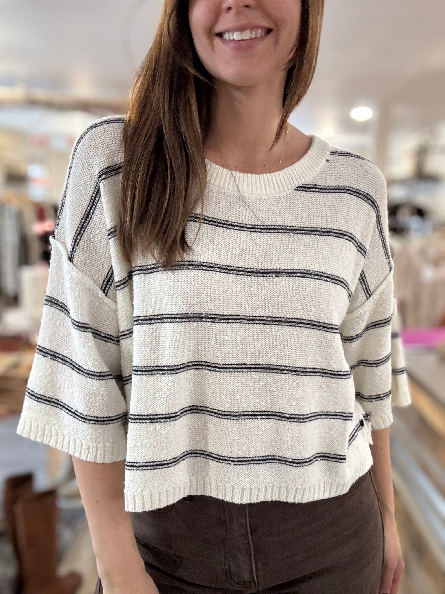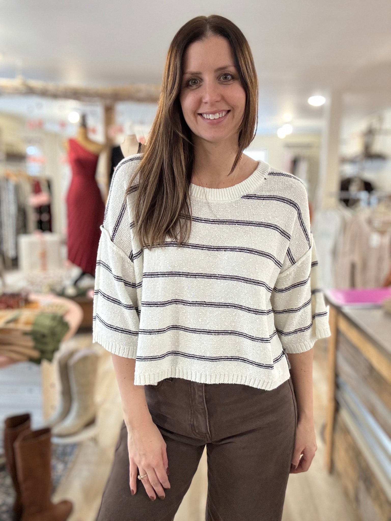 This can be styled with jeans or it's super cute styled over a dress. Also love stripes with a flowy pant!